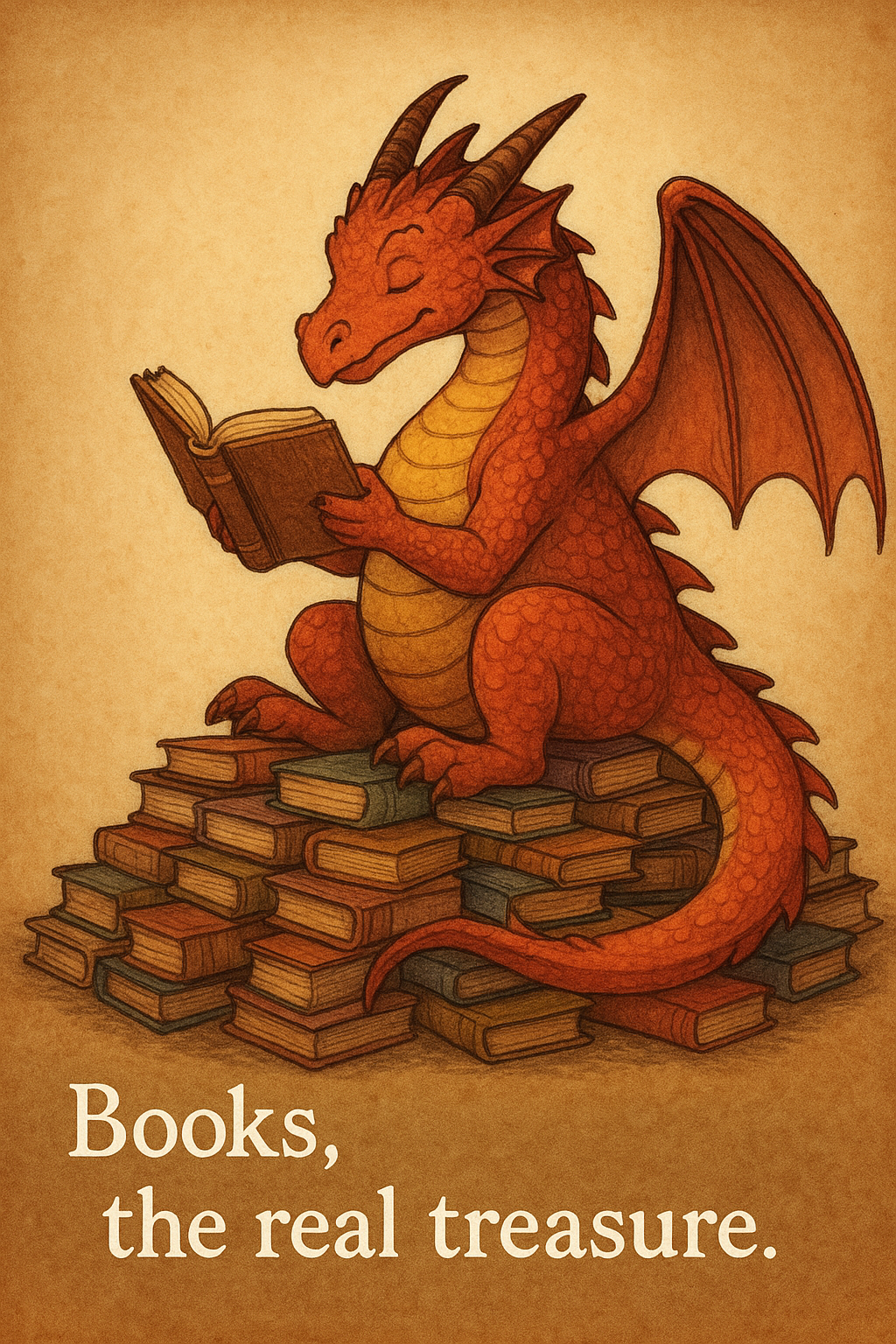 I created the dragon on a pile of books in Chat GPT. I told Chat GPT to "Draw a picture of a dragon sitting on a pile of books and reading a book. Below the dragon, write in white letters, "Books, the real treasure."